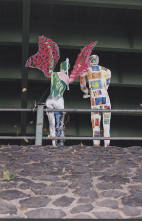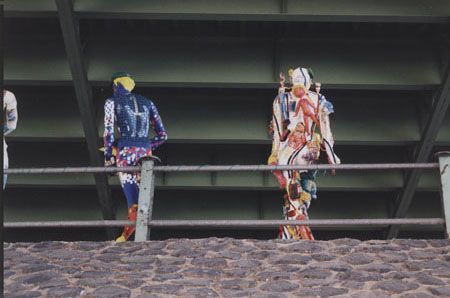eine Reihe phantastischer Gestalten, die am 27.10.2002 die als "Menschenkette" der besonderen Art am Rhein ausgestellt wurden.